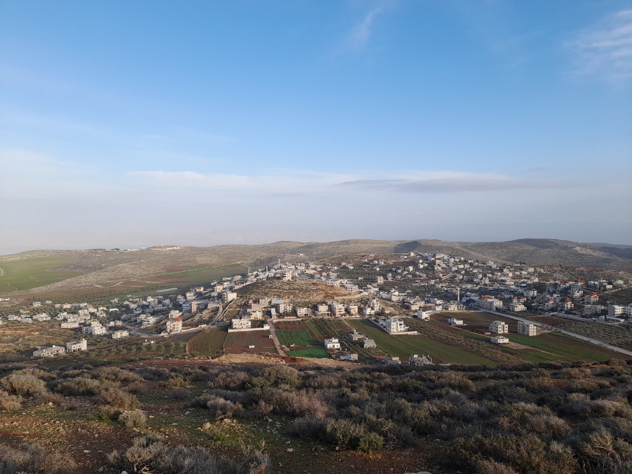 הכפר אל-מוע'ייר במבט מצפון, מהר כולצון. ברקע נראה היישוב מלאכי השלום וחוות מצודת דוד.
